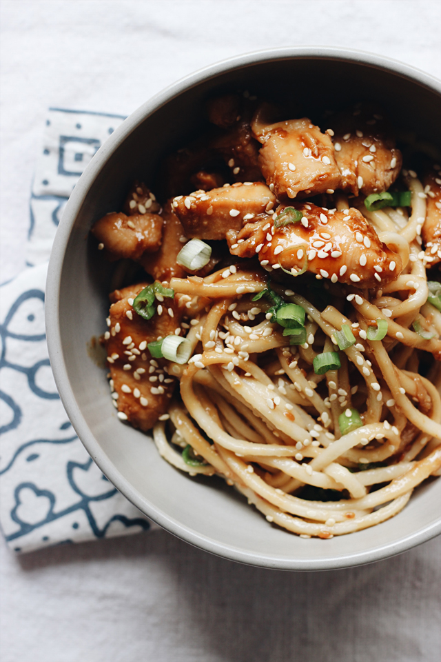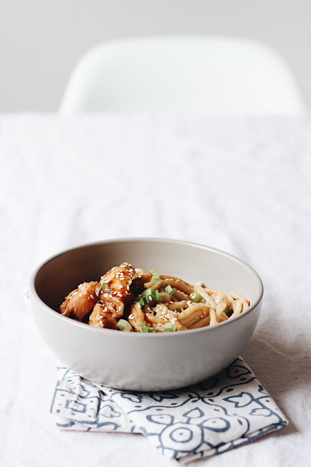 In a large ziploc bag add chicken, Kikkoman® Teriyaki Marinade & Sauce and garlic. Seal and let marinate in refrigerator for 20-30 minutes. In a large bowl mix together Kikkoman® Soy Sauce, canola oil, Kikkoman® Sesame Oil, Kikkoman® Rice Vinegar, and agave. Set aside. In a large pot of boiling water, cook udon noodles according to package directions. Let cool slightly and then add to the bowl with sauce. Add green onions and sesame seeds, toss together. Heat canola oil in a large skillet over medium heat. Add chicken and cook until golden brown and cooked through, about 5-6 minutes. Before taking it off the heat add the Kikkoman® Teriyaki Takumi Original Sauce, let cook for 1 minute longer and remove from heat. Serve noodles topped with the chicken and garnished with more sesame seeds and green onion, if desired.