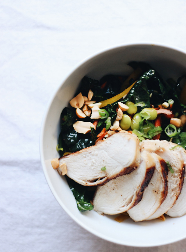 To assemble salad: In a large bowl toss together kale, carrots, pepper, 3 chopped green onions, and edamame with enough dressing to coat salad. Sprinkle top with peanuts and serve topped with sliced chicken.